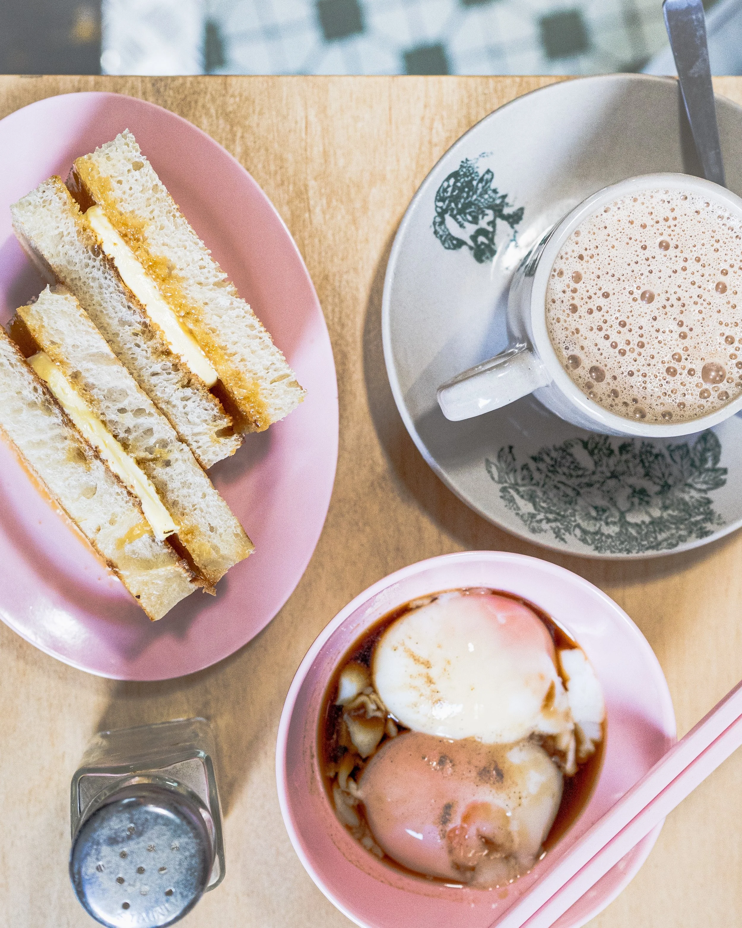 A traditional Singaporean breakfast of kaya toast, boiled eggs and butter coffee.